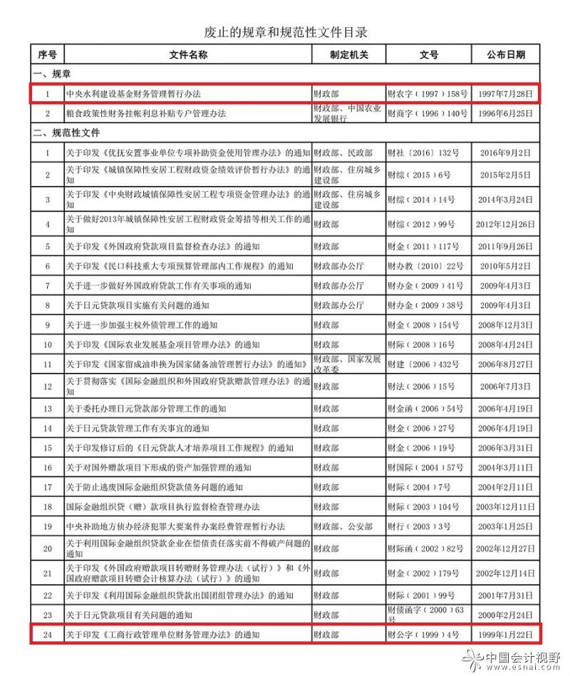 中国会计视野讯 财政部发布《关于废止部分规章和规范性文件的决定》,2份规章及24份规范性文件被废止,其中包括《中央水利建设基金财务管理暂行办法》和《工商行政管理单位财务管理办法》。